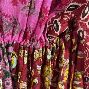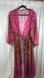 The image shows a Free People Bombay Mixed Print Kimono. This kimono is characterized by its vibrant, mixed prints in shades of pink and burgundy. It features a drawstring waist, wide sleeves, and a long, flowing silhouette, consistent with the bohemian aesthetic of the Free People brand. The mixed print design incorporates various patterns, including floral and paisley motifs, creating a patchwork effect.