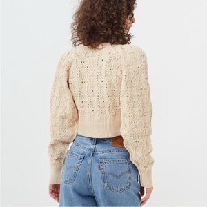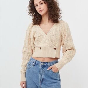 Free People Bonfire Cream Chunky V-Neck Cardigan Sweater with Balloon Sleeves.