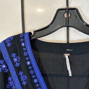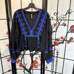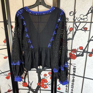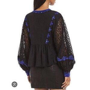 Free People Boogie All Night Black/Blue Lace Balloon Sleeve Peasant Top Size S Embroidered