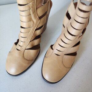 "EUC" Fantastic Tan Leather Cage Style Cut-out Bootie By Free People. Adjustable Double Buckles, Almond Toe, Stacked 3.5" Heel with Man Made Soles, Leather Upper, Lining & Cushioned Foot Bed, Made in Spain, Great Condition, No Wearing on Uppers, Minor Scuffing to Soles, Minor Markings Normal Light Use/ Wear:) Rt.178.00 approx. Size 39/9, Foot Bed Measures 10" for Reference. * These are Very Similar to Freebird Style, Worn in Leather Look.