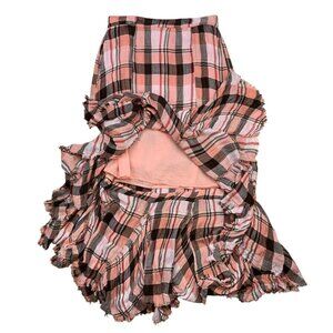 This Free People women's Bordeaux Plaid Maxi Skirt makes a statement due to it's pull-on fit, high rise, billowing column fit, elastic back waist, asymmetrical maxi frayed hem, distressing, lining and pink plaid design.