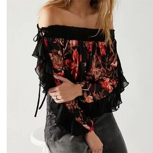 Elevate your boho style with this stunning off-the-shoulder floral blouse bodysuit from Intimately Free People. Featuring a bold floral print against a black background, this top exudes romantic vibes with its flowing, sheer fabric and layered ruffled sleeves. The elasticized neckline ensures a comfortable, secure fit, allowing you to wear it on or off the shoulders. With delicate tie details on the sleeves, this top adds an extra touch of charm. Perfect for pairing with high-waisted jeans or a skirt, it’s a versatile piece for both casual days and special nights out.