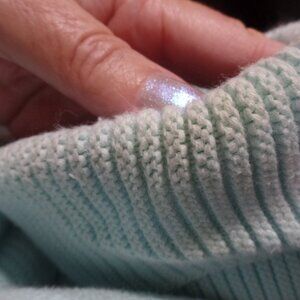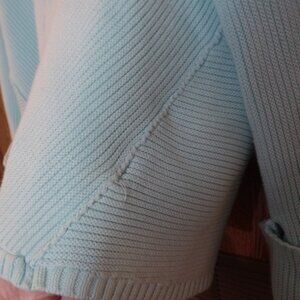 This is 100% cotton. It is recommended to hand-wash, but, for best results, dry clean. In the second picture, I am attempting to show you the ribbing on the sides of the sweater. In the third picture, I am attempting to show you some slight staining at the bottom of one of the sleeves. This will fit an XL.