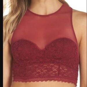 Lounge or layer in this pretty lace and mesh bralette with a high neckline and sporty racerback. Offers light support for most A-C cup sizes.Band sizing: S=34 - Slips on over head - Partially lined layer - Scalloped, lace layer at hem - Racerback - Imported