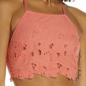 NWT Intimately Free People Coral June High Neck Bralette Crop Top. Great bohemian or festival look. Free People's lacy halter-neck piece is like a crop top mixed with a bralette. Wear it alone as a statement piece or layer it for a textural look. Eyelet pattern with semi-sheer mesh lining. Cotton with nylon/spandex lining. Adjustable racerback straps. Elastic band around bottom. Color is called Kiss Kiss. See size chart in photos.