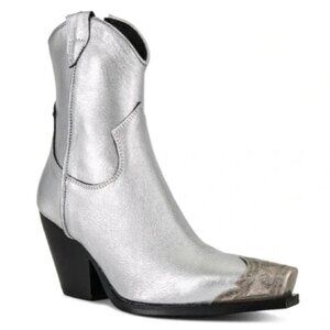Gorgeous Italian-crafted leather boots featured in a western-inspired style with an etched metal toe, slim sit and stacked heel.