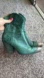 These striking green heeled boots feature a classic western silhouette with a rounded toe and a short, stacked heel. Crafted from supple leather, they boast a slightly distressed finish for a vintage appeal. The bold color and traditional construction make them a standout accessory.