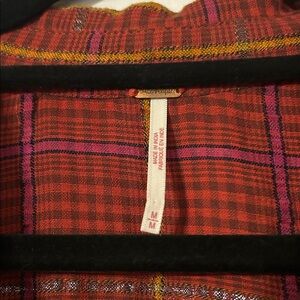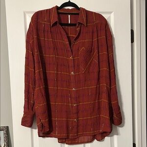 Stylish plaid button-down shirt by Free People in red, yellow & pink with metallic thread throughout. Features a classic collar, oversized fit and front pocket. Perfect for casual wear.
