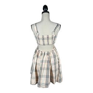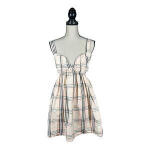 Free People Bridget Plaid Cut Out Mini Dress in a size medium. A-line silhouette with deep V-neckline. Has silicone strips at the bust to help stay in place. Cutout details at the side and back. Adjustable straps. Elastic smocking at back. Lined skirt. Two front pockets. 100% cotton, lining 100% modal. Measures approximately 16” armpit to armpit, and 26” in length not including straps. In great condition.