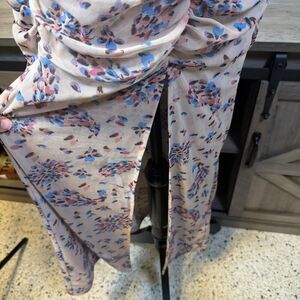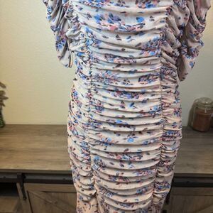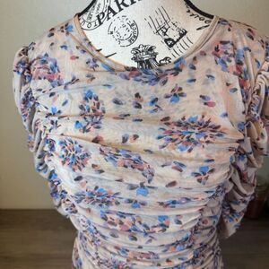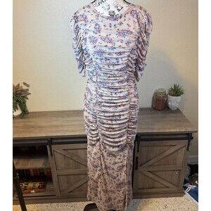 Free People Briella Ruched Midi Dress Tea Combo Floral Side Slit Puff Sleeve S