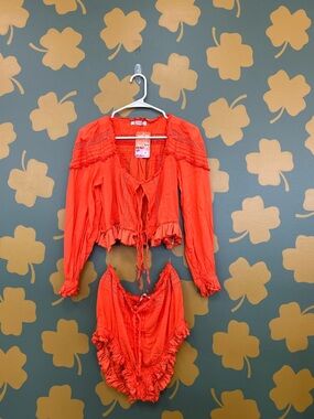 Free People matching top and bottoms in bright orange. Lightweight fabric with ruffle and tie details. Long sleeves and gathered cuffs. Playful, boho-inspired look. Easy to style for warm-weather wear.