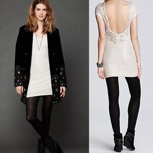 Free People Bringing Sexy Back Mini Dress in Shimmering Champagne. Decorated with beaded detailing, trimming a low cut back. A curve hugging silhouette, in a soft stretch jacquard construction, sprinkled with subtle silver flake.