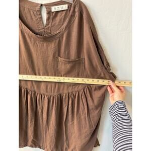 Relaxed fit with a round neckline. Features a front pocket and gathered waist. Perfect for casual wear.
