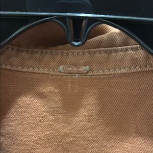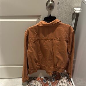 Stylish brown jean jacket. Features button closure and front pockets. Perfect for casual wear.