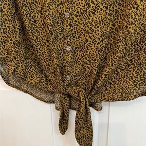 Stylish leopard print blouse with tie-front. Features button-down design and short sleeves. Perfect for casual outings. Size M.