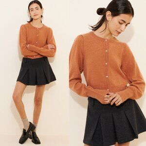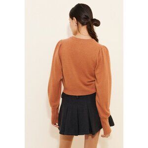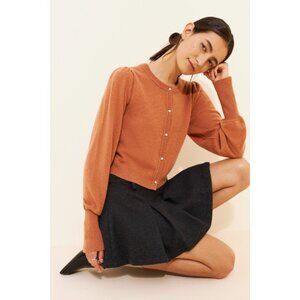 Chic rust cardigan with puff sleeves. Features elegant button closure. Ideal for layering.