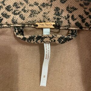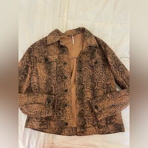 Stylish snake print jean jacket. Features button-up front. Adds a trendy touch to any outfit.