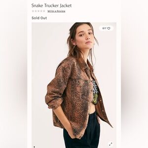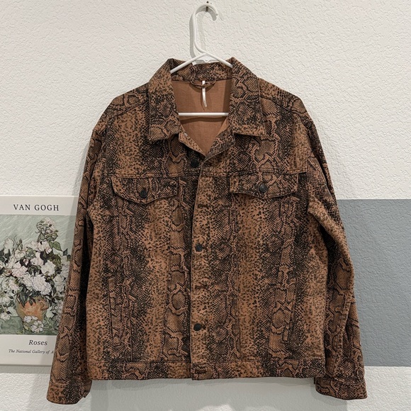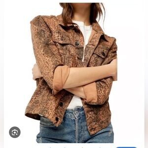 Free People snake printed trucker jacket. Brown, size L. See pics for fit on model and description. Very cute jacket. No rips or stains.