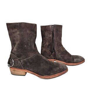 Tags: suede boots, brown boots, mid-calf boots, wooden heel, Free People boots, women’s boots, size 7 boots, side zipper boots, strap detail boots, suede footwear, casual boots, stylish boots, durable boots