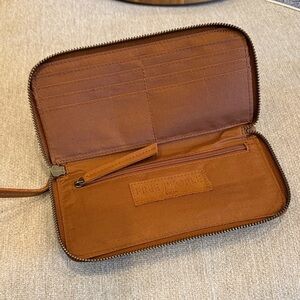 Stylish brown wristlet wallet featuring a front zipper pocket. Perfect for on-the-go convenience.