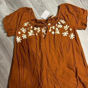 This charming mini dress from Free People features a warm brown hue adorned with intricate white embellishments. The cap sleeves and ruffled details add a touch of elegance, making it perfect for both casual outings and special occasions. Its relaxed fit ensures comfort while maintaining a stylish, eye-catching look. New with tags