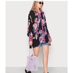 Delightful blooms brighten this flowy button-up tunic that's full of boho charm.