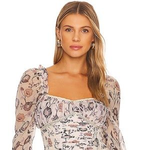 Romantic and forever femme, this stunning bodysuit features a sweetheart neckline with ruched detailing at the bodice and puffed sleeves in a vintage-inspired floral print.