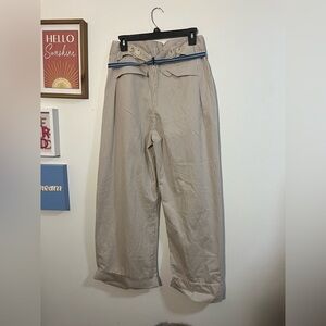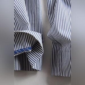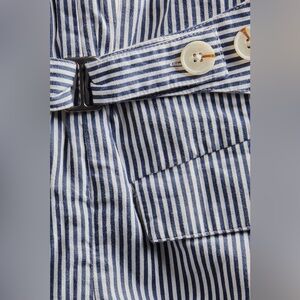 Features: Zip fly and hook-and-eye closure, four-pocket design, back buckle detailing for adjustable fit, pleating at the top, remove self-belt tie, classic striped pattern