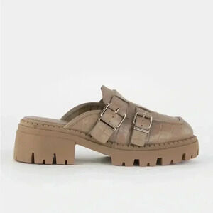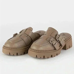A classic style gets a makeover with these chunky loafers, featured in a mule style with a lug sole, croc texture, and double-buckle detail. Slip-on style, backless design. Round toe. Leather uppers. Chunky block heel. Lined footbed. Approx. heel height: 2.5''. Imported.