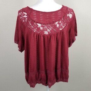 Free People Burgundy Lace Yoke Short Sleeve Crochet Knit Top Womens Size S