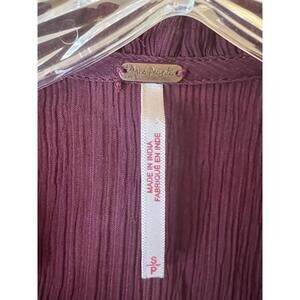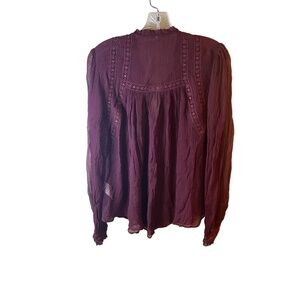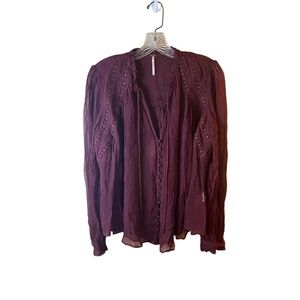 Free People Burgundy Long Sleeve Lace Trim Button Front Sheer Boho Blouse Small