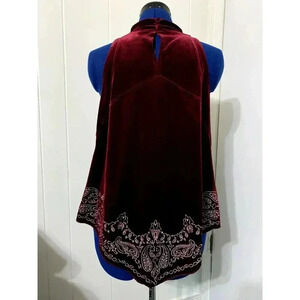 Elegant burgundy blouse with intricate paisley design. Sleeveless and flowy. Perfect for casual or dressy occasions.