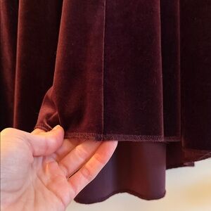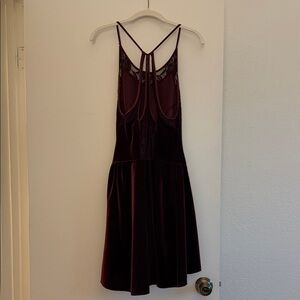This elegant burgundy velvet dress is perfect for any occasion. Its rich color and soft fabric offer a luxurious feel. Ideal for evening events or a night out. Lacy detailing and a strappy back for a fun detail!