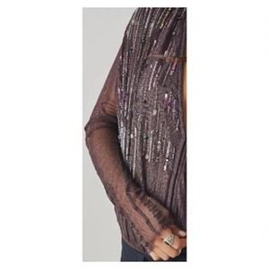 Features: Soft lacey fabrication, sequin-adorned details, deep V-neckline, pleating at back, gathered detailing at shoulders