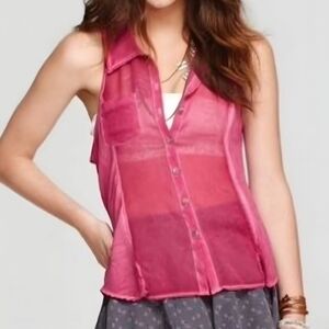 Free People Button Down Top – Rich Pink, Sheer Seam Stripes, Sleeveless Collared