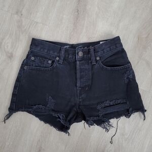 Urban Outfitters Free People We The Free True Black Jean Shorts preowned in wonderful condition. Factory distressing throughout, button fly, 5 pocket, fray distressed hem.