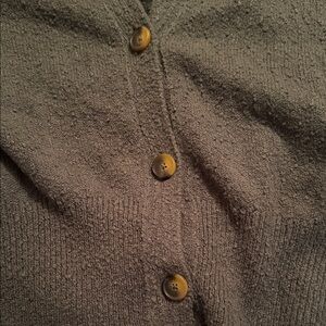 Textured knit cardigan with a deep V-neck. Three-button front closure for easy layering. Long sleeves with ribbed cuffs. Relaxed, cozy silhouette ideal for everyday wear.