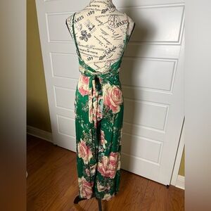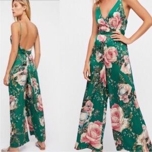 Keywords: Free People jumpsuit, floral wide-leg jumpsuit, size 0, boho backless romper, green rose print, summer outfit, open back jumpsuit, adjustable straps, Free People one-piece, EUC women’s jumpsuit