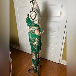 Turn heads in this stunning Free People floral wide-leg jumpsuit, size 0. Featuring a deep V-neckline, adjustable spaghetti straps, and a flattering open back with a tie detail, this piece combines effortless elegance with boho charm. The bold green base is beautifully complemented by large pink rose prints, creating a statement look perfect for vacations, weddings, or garden parties. Lightweight and flowy, this jumpsuit offers comfort and style in one. Excellent used condition with no flaws.