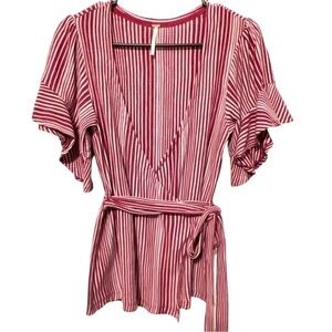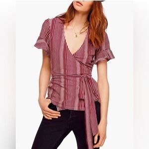 Free People Cache Coeur Top Blouse Shirt Maroon Burgundy Red Gray Striped Wrap Top Deep V Neck with Bell Style Sleeve Size Small