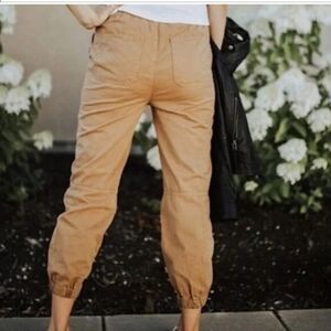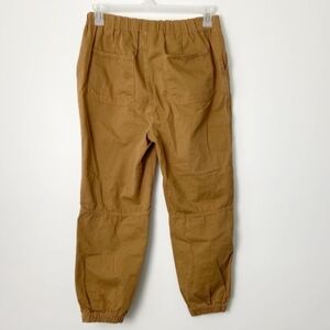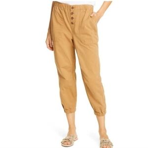 This fun and fashionable pull-on jogger pant is so comfortable and versatile it will become a favorite addition to your wardrobe *Capri-style with a high-rise waist seamed knees and gathered bottom hems *Front and back pockets *Relaxed fit *Elastic waistband with exposed button closure. 100% cotton.