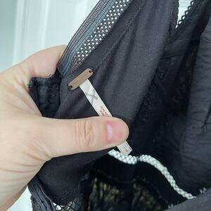Black embroidered bustier corset bodice with contrasting knife pleated striped skirt. Lattice crochet pieces. Mesh-like straps. The bodice features hook-and-eye closures, with a concealed zipper on the skirt.