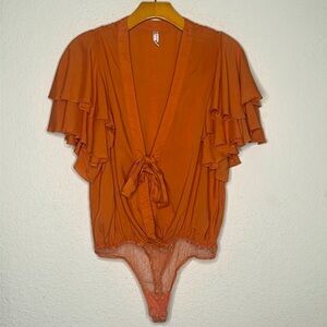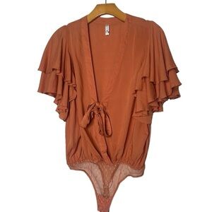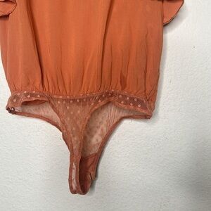 Free People Call Me Later Ruffle Sleeve Plunge Tie Bodysuit Swiss Dot Bottom Sm