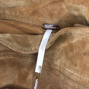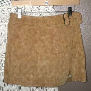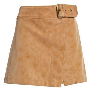 Free People Ari Wrap Skirt size XS. color is camel. With a nod to the mod '60's, this leather-look wrap skirt has an asymmetrical wrap-style front and a belted finish.