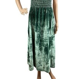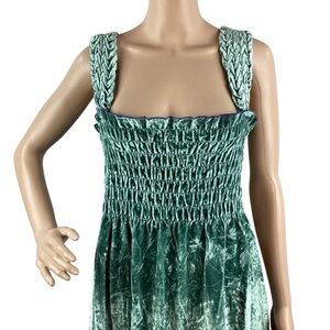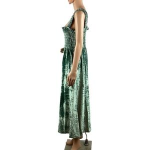 Design Features: The Free People Camille Midi Dress is a romantic and elegant piece made from soft, plush velvet in a rich sapphire hue that leans more green than blue. It features a smocked bodice for a fitted, stretchy feel, while the A-line skirt drapes beautifully for a relaxed yet flattering shape. A side slit adds movement and a subtle hint of allure. Designed as a pullover style, this dress offers effortless wear with a midi-length hem for a timeless, vintage-inspired look.