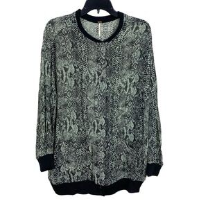 This is a Free People oversized slouchy bomber cardigan jacket. Sheer green gray snake print with black wool ribbed knit trim. Snap front closure. Long sleeves. Tunic length. Women’s size S or small. Bust closed 21”. Length 29”. Great piece.