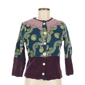Appliqued fabric on the front of the cardigan and sleeves. EUC