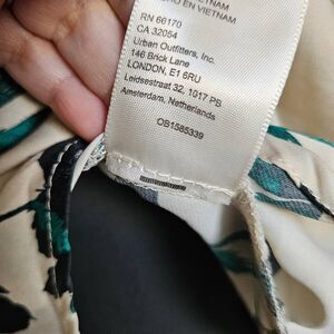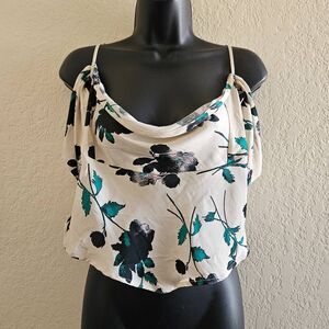 Turn heads in this romantic off-shoulder crop top from Free People. The Cassandra style features a silky ivory base with a vintage-inspired floral print in shades of black, teal, and soft lavender. Designed with slim adjustable spaghetti straps, a smocked back, and draped off-shoulder sleeves, it blends effortless bohemian charm with a flirty, modern silhouette.