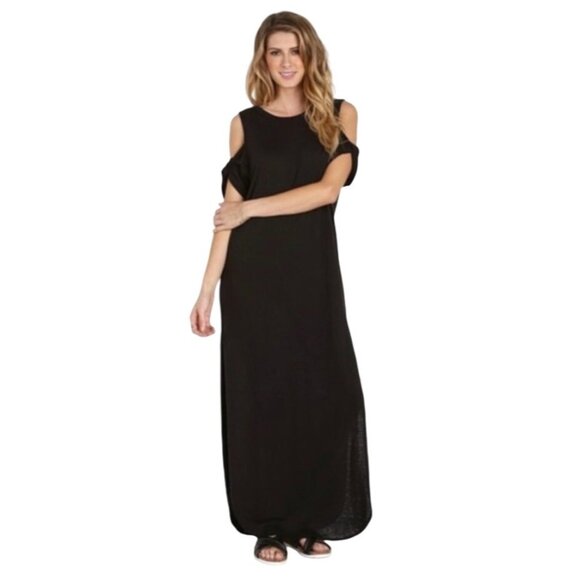 Free People Casual Black Cold Shoulder Side Slits Relaxed Boho Jersey Maxi Dress
