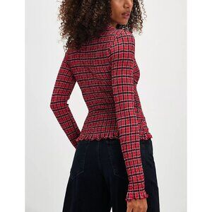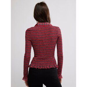 Stylish red plaid button-up top for women. Perfect for casual outings or a chic office look.